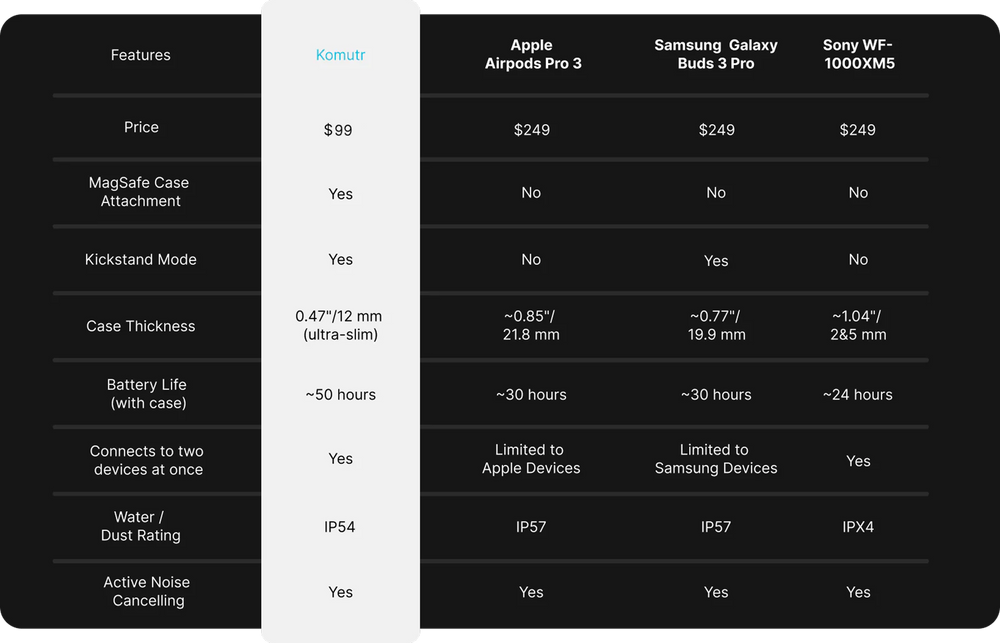 The new Komutr MagSafe earbuds are perhaps the most practical I've tested. Ultra-thin, they clip directly onto the back of your iPhone thanks to MagSafe and even double as a stand for watching videos. Super lightweight, with good battery life, a dedicated app, and even built-in Apple Find My so you never lose them again. A true alternative to traditional earbuds for those who want something compact, convenient, and always with them.